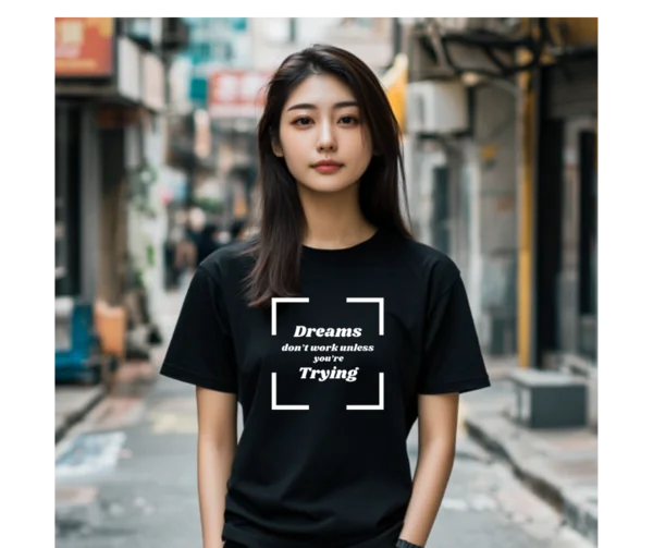 The words "Dreams don't work unless you're Trying" are more than just words; they are a mantra that encourages you to step out of your comfort zone and strive for greatness. The bracketed box adds emphasis and a touch of sophistication to the design.